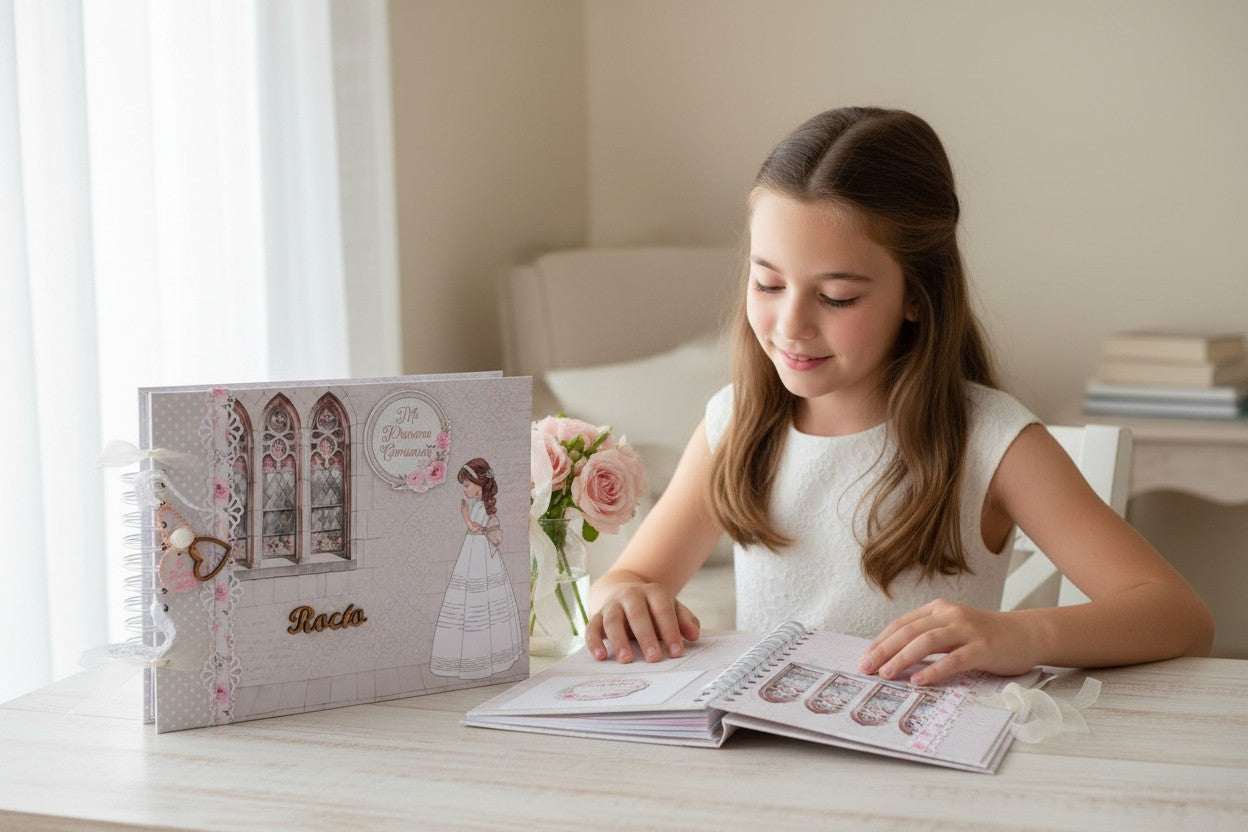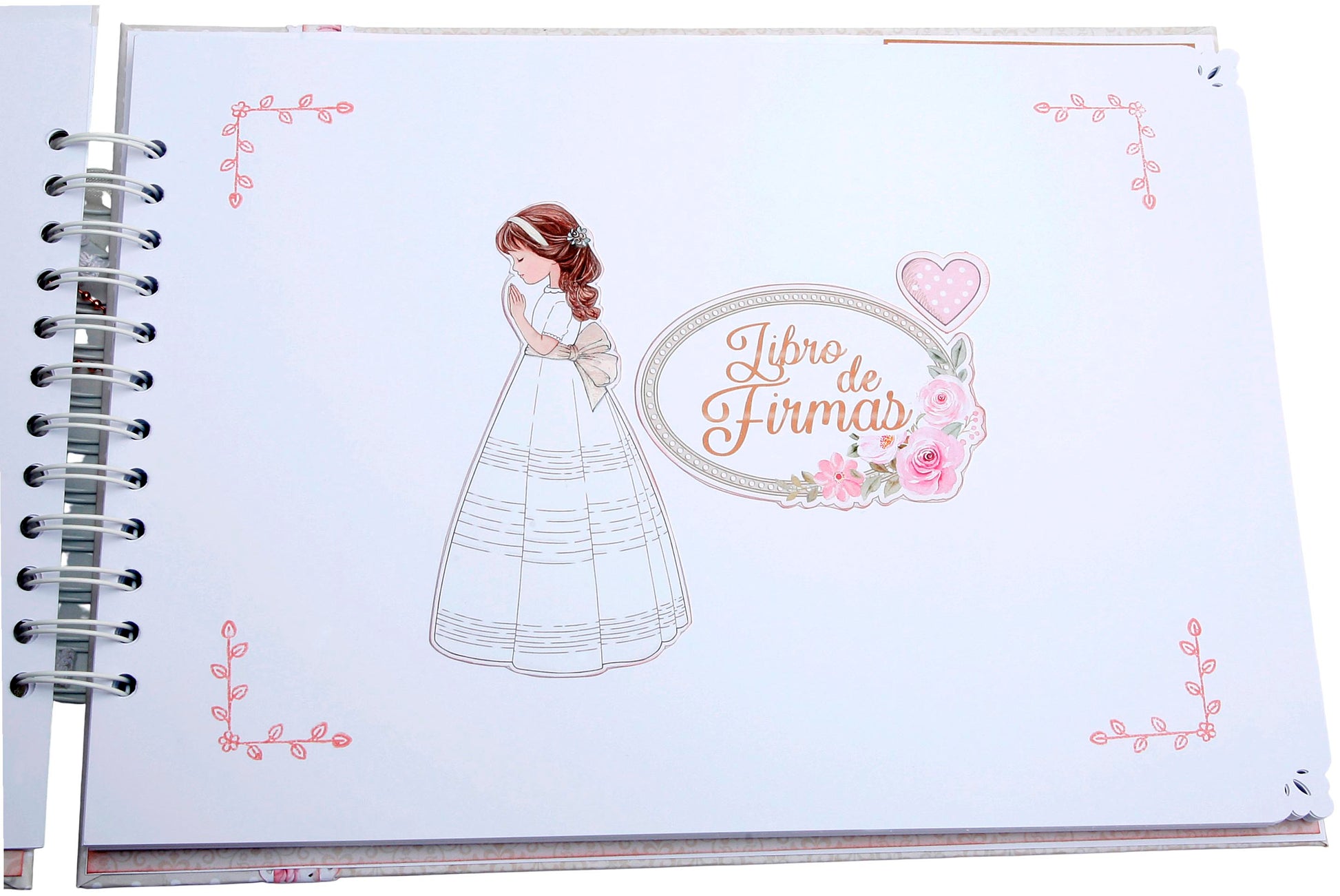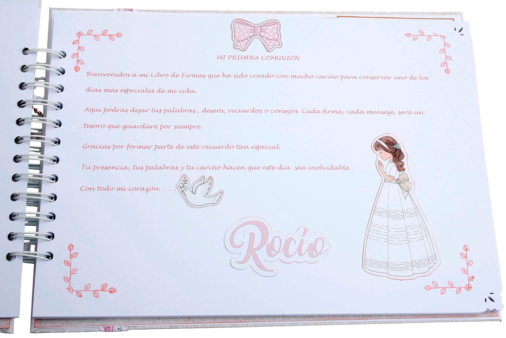 Un libro de firmas para comunión es una hermosa manera de guardar los recuerdos de este importante día en la vida de un niño. Este libro de firmas está diseñado con una portada elegante y es personalizado con el nombre y la fecha de la comunión. Las páginas interiores están listas para ser llenada con mensajes y deseos de familiares y amigos que asisten al evento y fotografías del momento. Esta es una oportunidad perfecta para que los invitados dejen sus buenos deseos, anécdotas y recuerdos que el niño y su familia pueden disfrutar durante años. El libro de firmas es un recuerdo que seguirá siendo valioso a medida que el niño crece y se convierte en adulto.